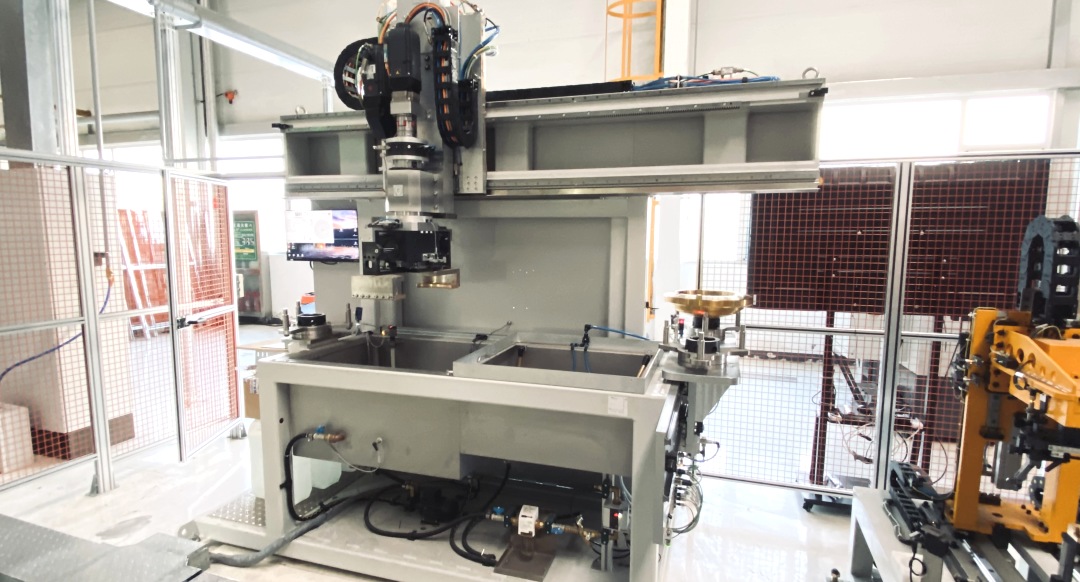 用于齒輪與差速器殼體的焊接質量探傷檢測,包含冷卻、探傷、干燥等工序內容,設備內部配置夾持機械手,用于在內部位置之間轉移工件。