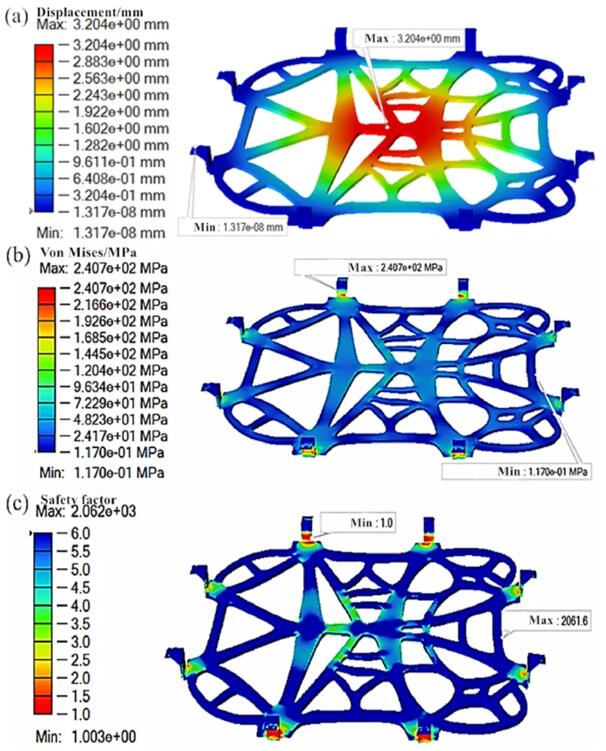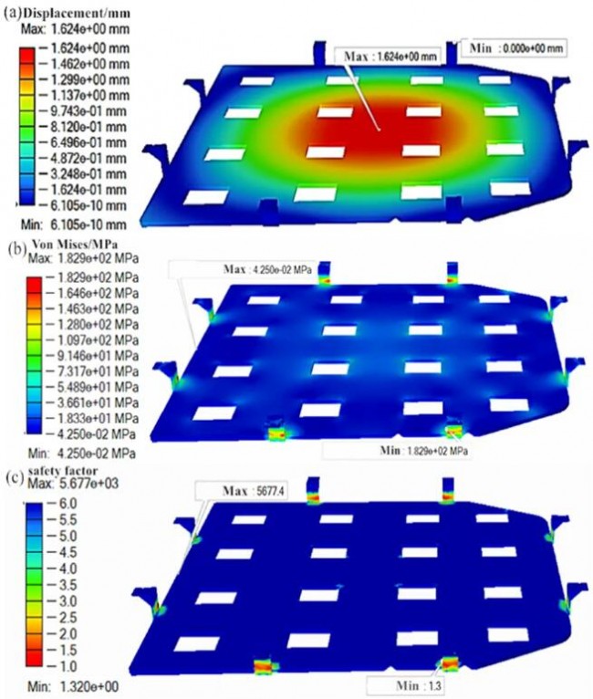 3D Systems_Auto3▲電池載體的受力分析結果:(a)位移云圖;(b)應力云圖;(c)安全系數(shù)。