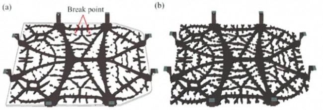 3D Systems_Auto5▲電池托盤拓撲優(yōu)化結果:(a)調(diào)整前;(b)調(diào)整后