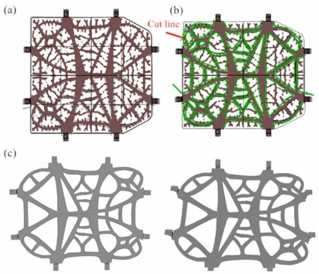 3D Systems_Auto6▲拓撲優(yōu)化模型的重構:(a)圖像和模型的導入;(b)切割線的劃分;(c)重構效果。