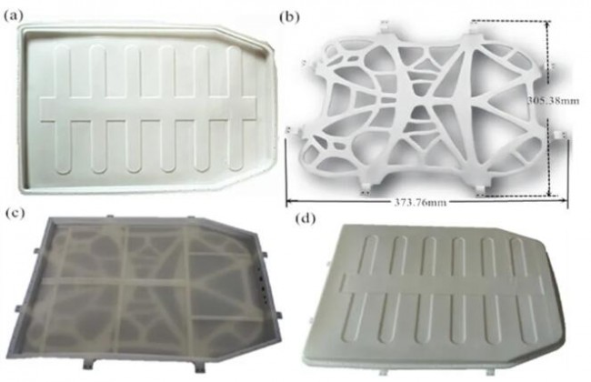 3D Systems_Auto11▲3D打印電池包裝分析:(a)上托盤;(b)下托盤;(c)下托盤支架;(d)整體組裝效果。
