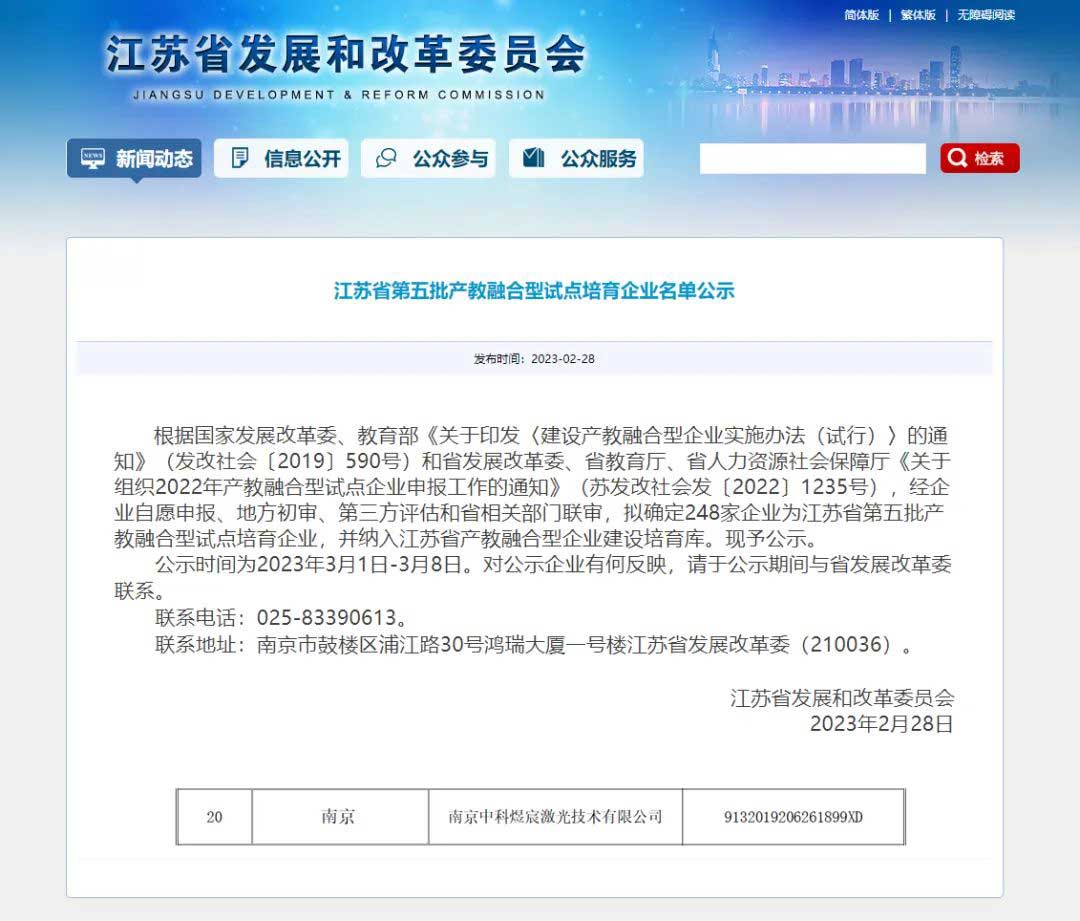 2月28日,江蘇省發展和改革委員會發布通知,公布江蘇省第五批產教融合型試點培育企業名單,中科煜宸成功入選,并被納入江蘇省產教融合型企業建設培育庫。